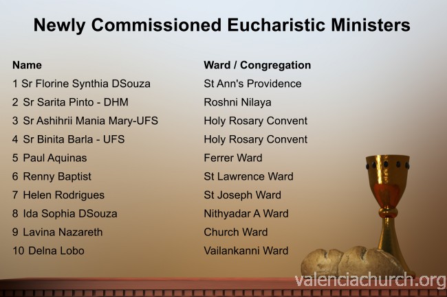 10 new extraordinary eucharistic ministers were commissioned by the parish priest Fr Roque DSa on 6th July 2024 during the 5pm mass. After the mass holy adoration was conducted by assistant parish priest Fr Pradeep Rodrigues, which was attended by all the eucharistic ministers.